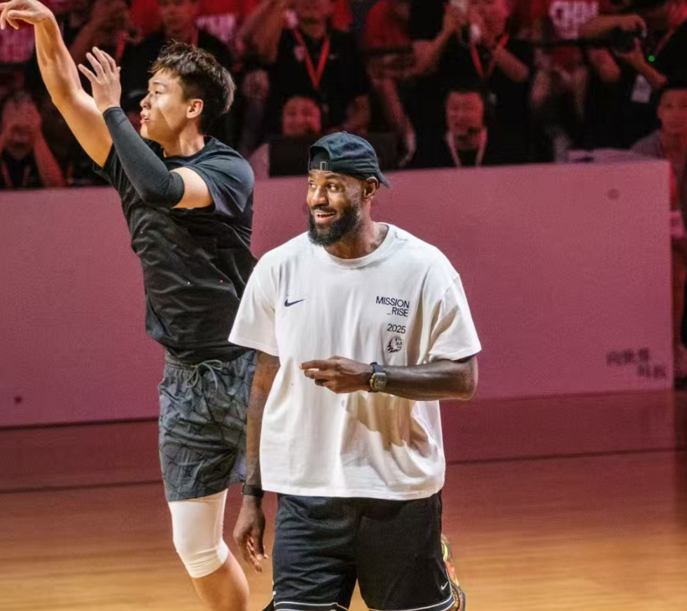 詹姆斯中国行,整体的阵容也是比较豪华的,因为国内签约了耐克的球员还是比较多的。所以在这种情况下,赵睿、崔永熙和李梦都参加了。特别是赵睿,下午的时候他还和詹姆斯一起执教了一下国青球员,两个人还进行了同框。